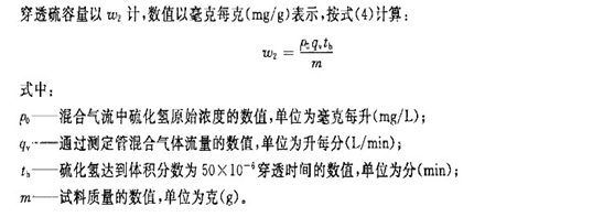 在一定的試驗條件下,利用活性炭的多孔性,吸附一定濃度的硫化氫氣體,當透過活性炭試料層的硫化氫氣體濃度達到體積分數50*10-6時,這段時間內每克活性炭吸附硫化氫氣體的質量即為活性炭的穿透硫容量。